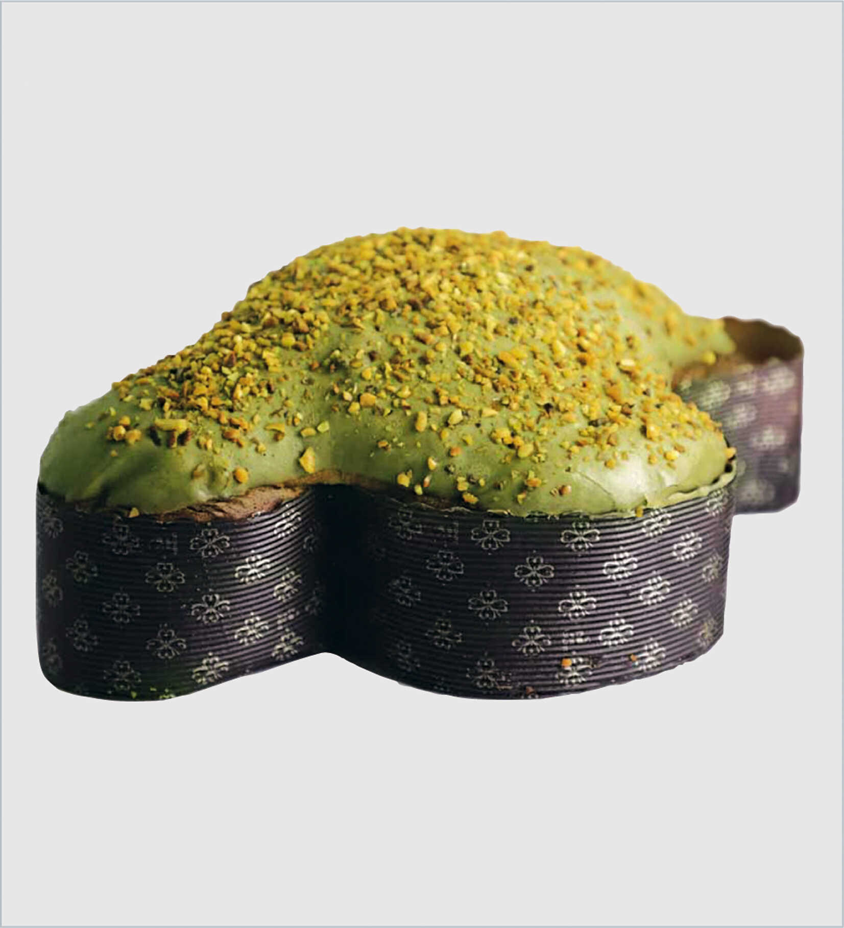 Bella e invitante, con una decorazione bianca in cima che ricorda la ghiaccia della colomba tradizionale. Buona la lievitazione, è molto ben sviluppata, ha un bel colore ed è cotta bene. L’impasto al pistacchio, l’alveolatura fine e le sensazioni aromatiche regalano al palato sapori decisi, ma delicati. La trama è morbida, setosa e molto masticabile con il morso animato da amarene candite artigianali. L’unione, tra amarene e pistacchi, fa la forza.