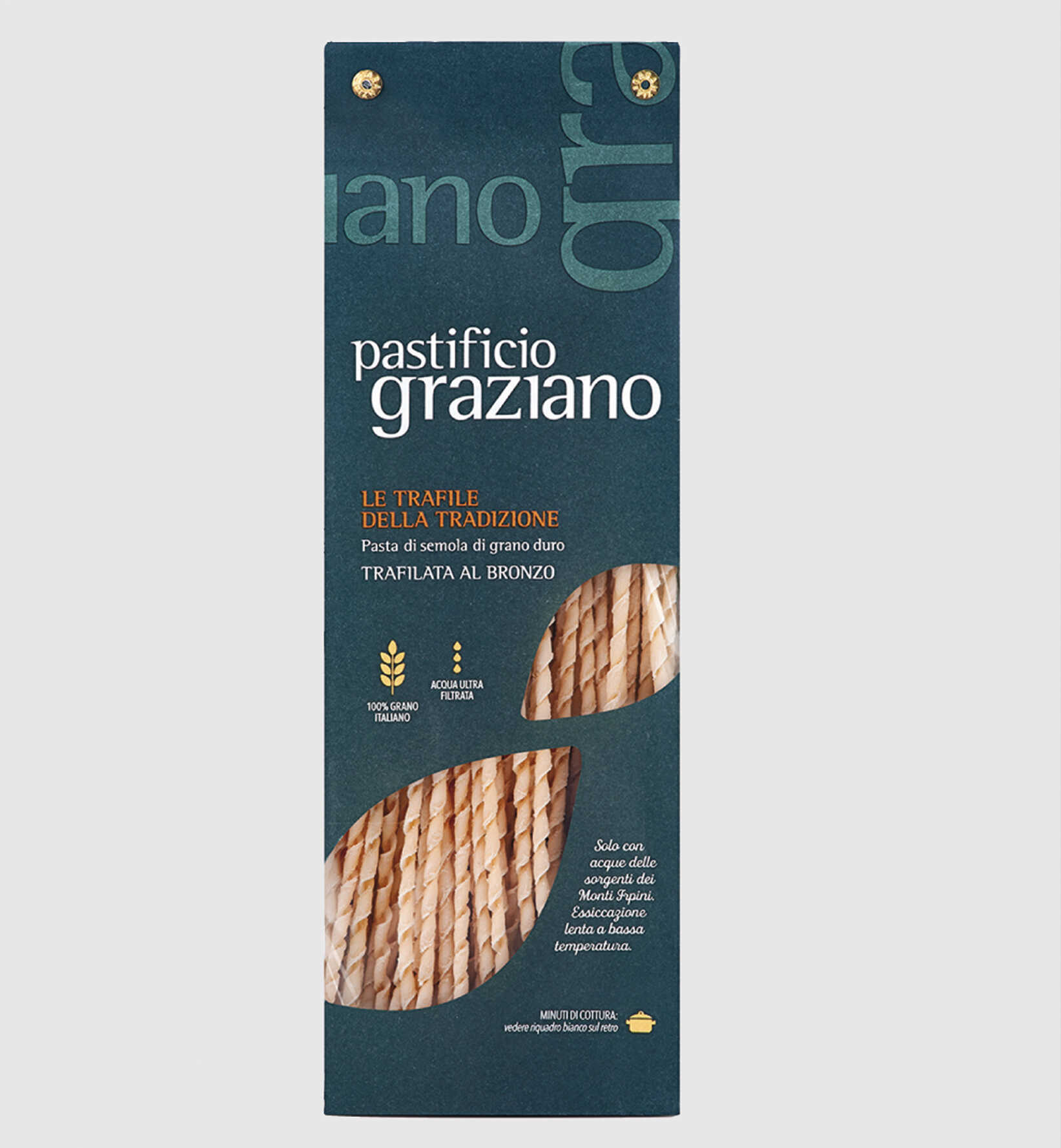 Antico formato di pasta dell’Irpinia, un tempo preparato a mano dalle massaie con un impasto di farina di semola di grano duro, acqua e il ferro da calza. Il Pastificio lo realizza per estrusione con una trafila in bronzo, che dona alla pasta la forma attorcigliata su sé stessa e la superficie rugosa e porosa. Nella versione lunga o corta, è perfetto con sughi corposi o il ragù.