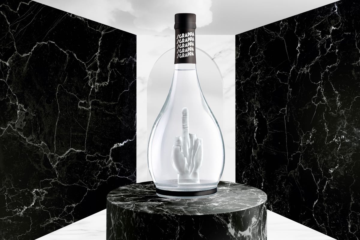 Sgrappa è nata come una sfida tra amici”, rivela Charley Vezza, Global Creative Orchestrator del brand di design Gufram (uno dei marchi più originali del design italiano). “Una sera eravamo a casa io, Paolo e Maurizio e siamo arrivati al tipico momento ‘Dai, un ultimo cocktail’, ma era finito tutto. Era rimasta solo una bottiglia di grappa, uno di quei classici regali indesiderati. ‘E se la misceliamo con la tonica?’, ci siamo detti… Ovviamente quell’ultimo cocktail non fu per niente l’ultimo. E per niente buono! Però l’idea di farci una grappa tutta nostra, buona da miscelare, ce la siamo ricordata stranamente anche il giorno dopo. Oltre al gusto, abbiamo rinnovato anche il design della bottiglia ispirandoci al vecchio fiasco di vino”. Così un fiasco è diventato un oggetto iconico – anche grazie alla cifra visionaria di Cattelan che ci ha inserito all’interno un incontrovertibile e ironico gesto artistico (leggi: dito medio) – e la loro grappa un prodotto da bere, sì, liscio, ma anche miscelato.
